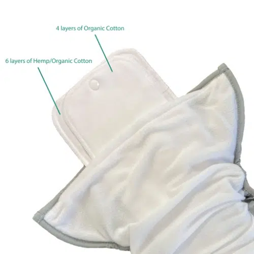 Este pañal Rellenable tiene un Absorbente de tamaño grande en cáñamo y algodón, y otro absorbente de talla un poco más pequeña en algodón orgánico 100%. Se pueden utilizar los Absorbentes individual o conjuntamente.